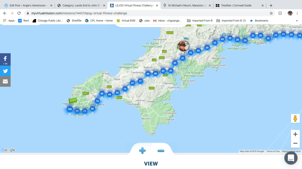 I decided to go back to when our stay at home order began and added up the mileage between the walk and bike rides up until April 19th. So on my virtual map, that puts me just outside of the small village of Tresillian, a distance of around 46 miles.