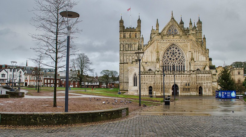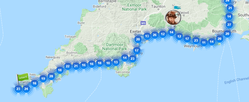 Normally after I’ve moved my little head along the map I receive a postcard from the virtual challenge team of interesting sites I would have passed along the way. Apparently there was nothing that stood out along this part of the route. I find that hard to believe so I did some digging of my own. Staying true to the human powered transport, I am virtually peddling the thirty miles or so towards Exeter, which looks like a lovely spot for a brief visit to the cathedral and the Cathedral Close, which has been the center of Exeter since Roman times. A church was built in the 1200’s and walled off with the creation of seven gates leading to the courtyard, or close. Don’t forget the obligatory picture of Mol’s Coffee House, which dates back to the 16th century and was purportedly where Sir Francis Drake discussed his plans for defeating the Spanish Armada.